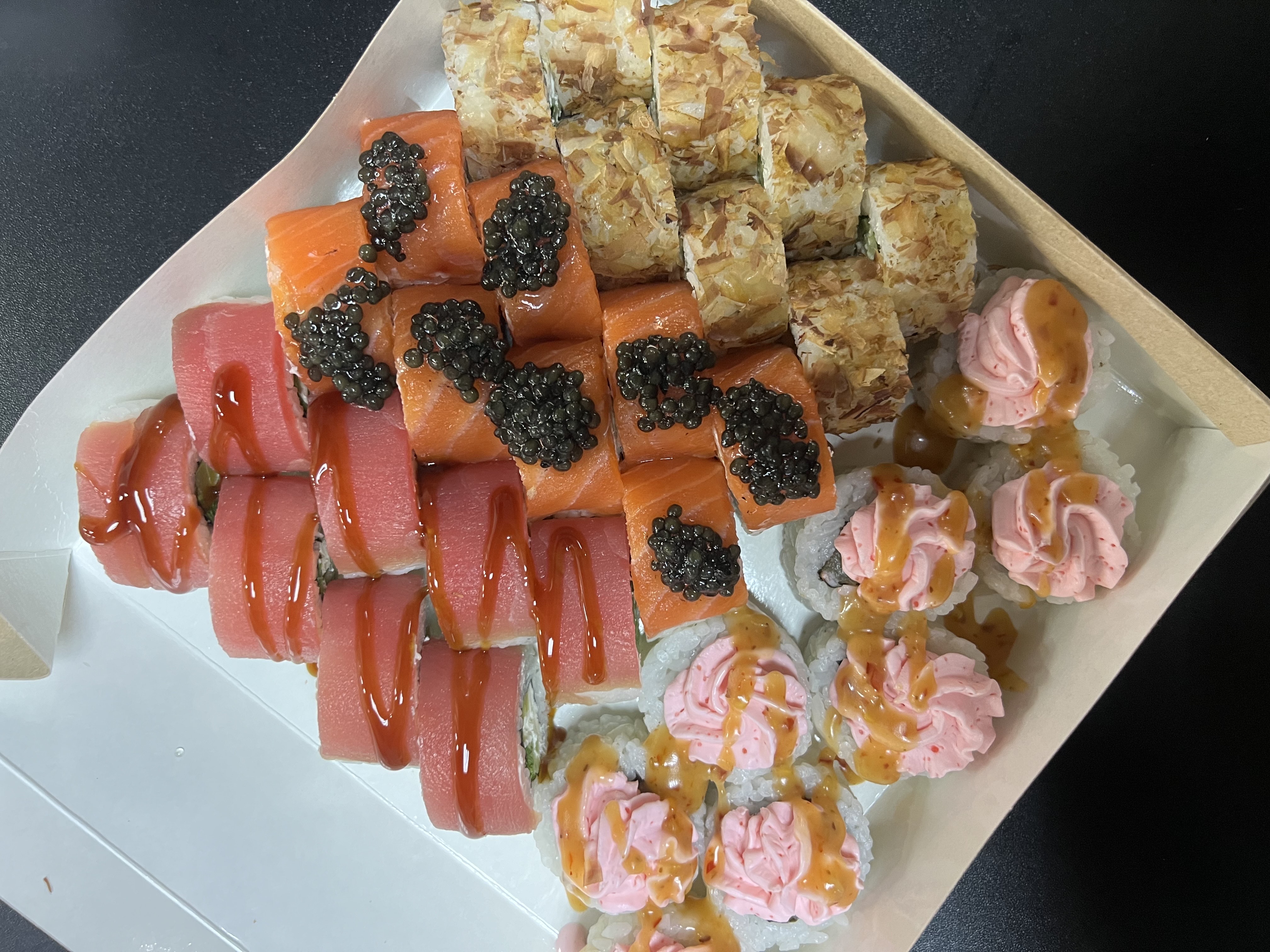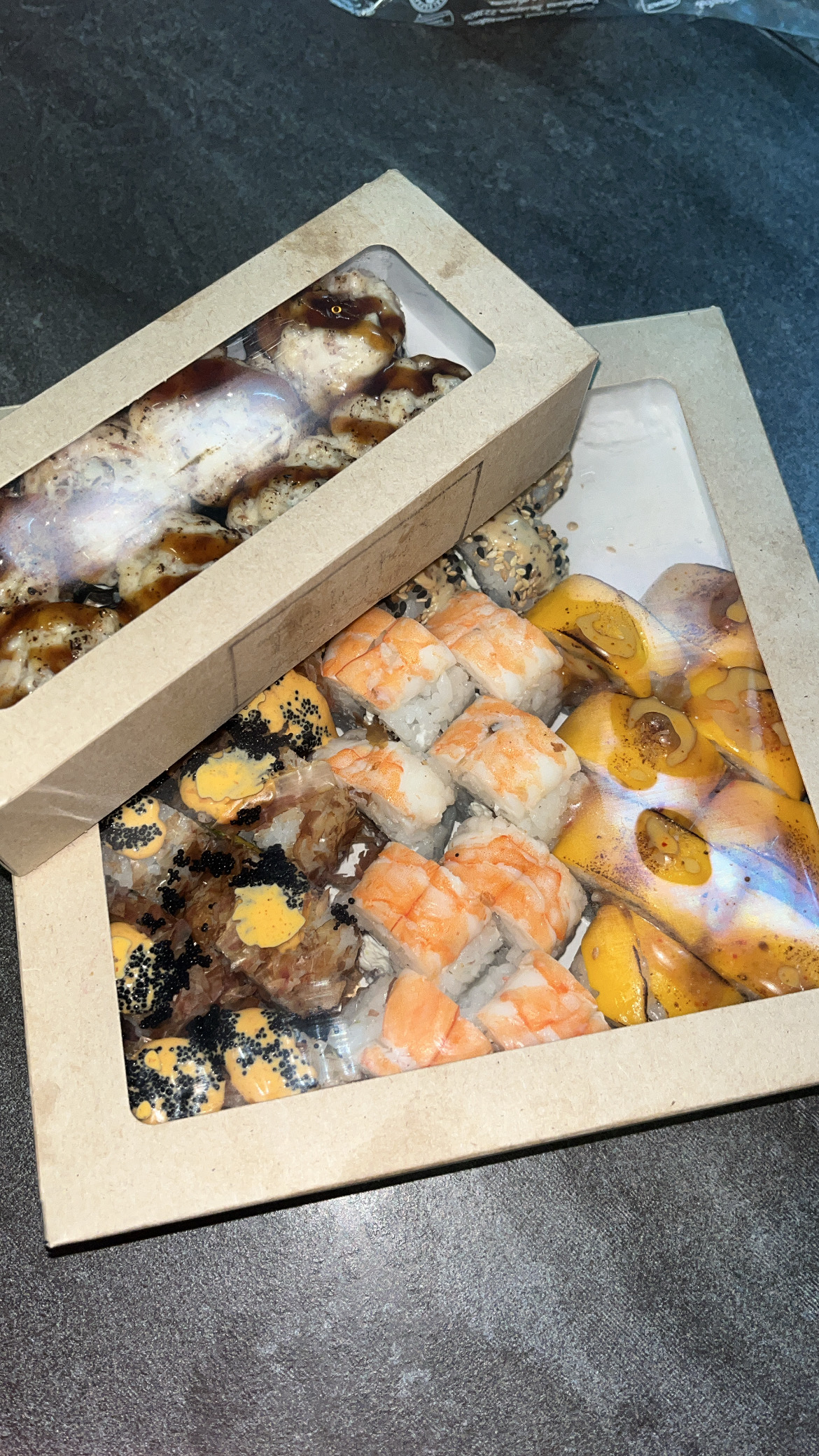 - "Бостон": креветка, сливочный сыр, ананас, салат Айсберг, соус сладко-ореховый, икра Тобико красная. Острое - 8 шт.