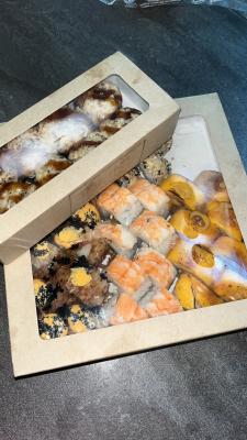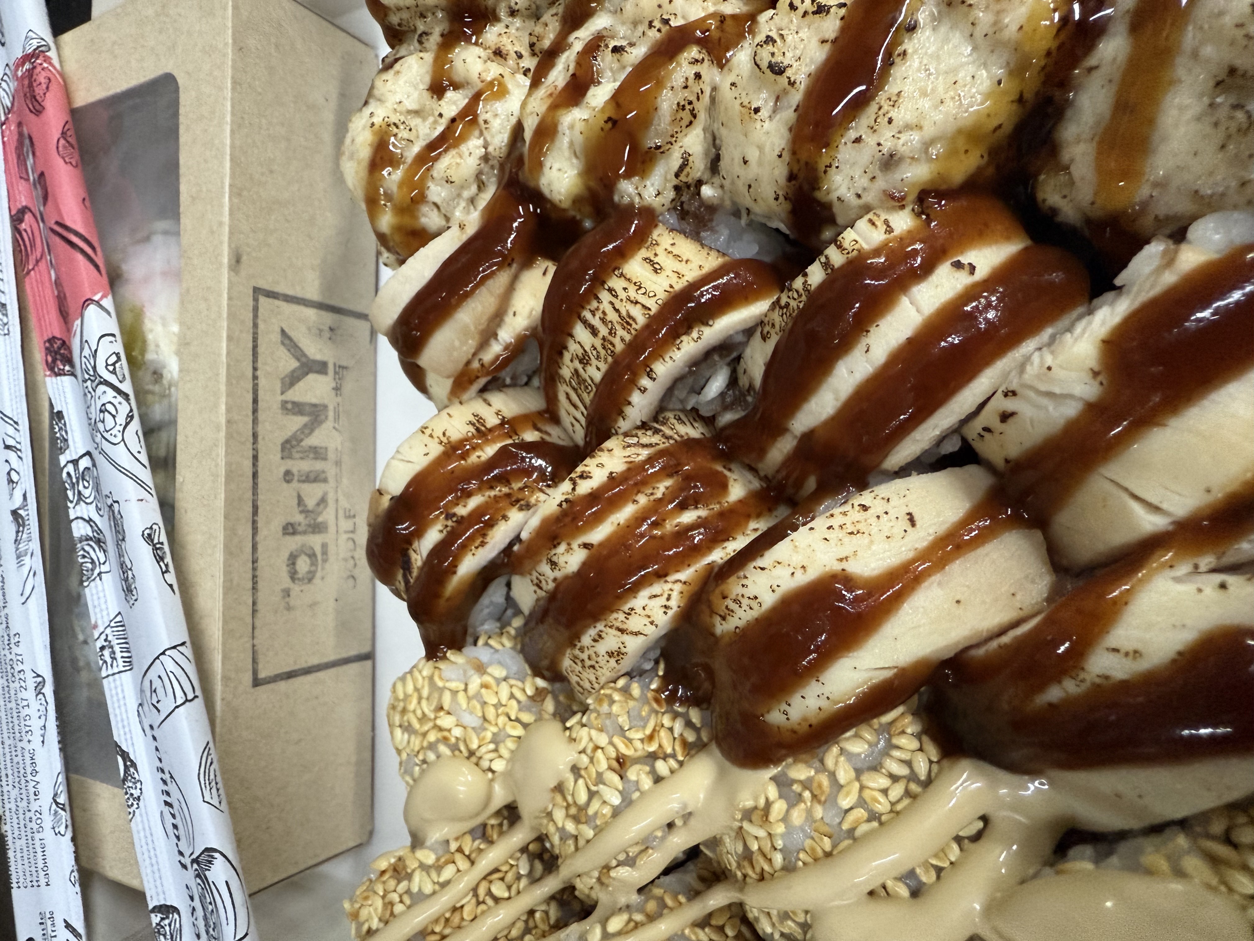 - "Брайтон": филе тунца, сливочный сыр, такуан, огурец, лук зеленый, соус пряный, соус терияки, орехи кешью - 8 шт.