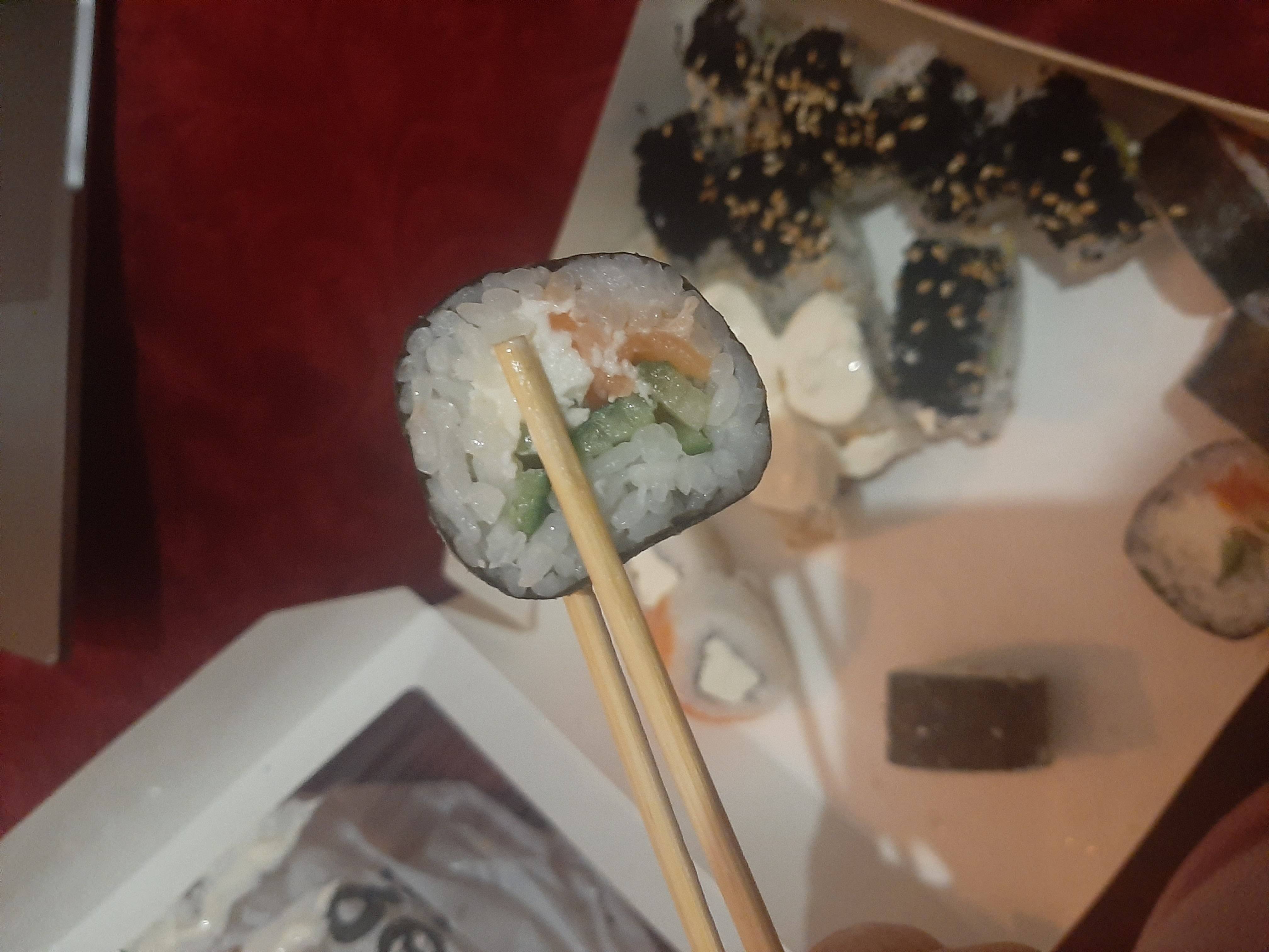 - "Фила огурец": филе лосося, сливочный сыр, огурец, икра Осетровая имитация - 8 шт.