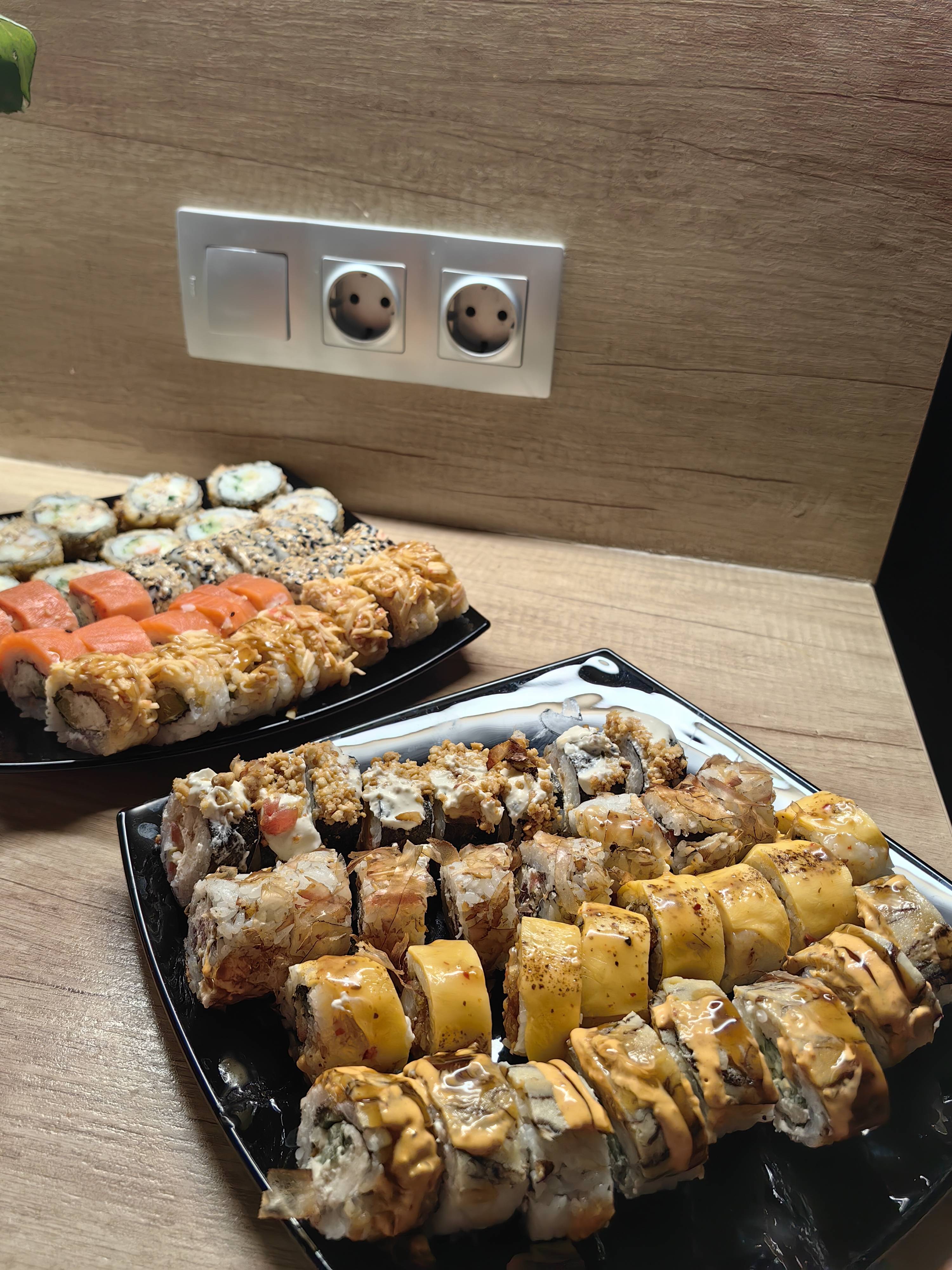 - "Ролл с жаренным окунем и ореховым соусом": жареный окунь, сливочный сыр, огурец, кунжут, соус ореховый - 8 шт.