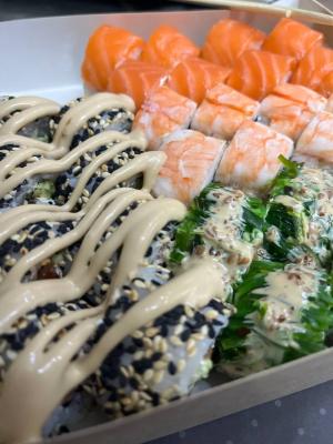 - "Томаму": филе лосося, сливочный сыр, салат чука, соус ореховый - 8 шт.