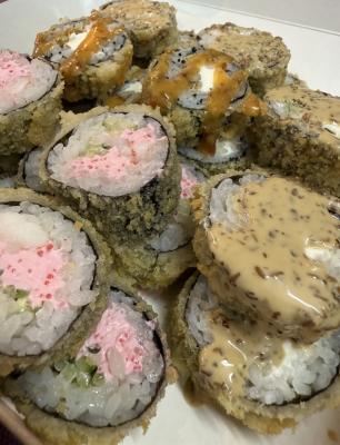 - "Аризона фрай": филе лосося, сливочный сыр, огурец, такуан, панировка - 5 шт.