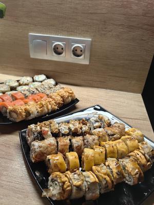 - "Ролл с жаренным окунем": жареный окунь, сливочный сыр, огурец - 8 шт.