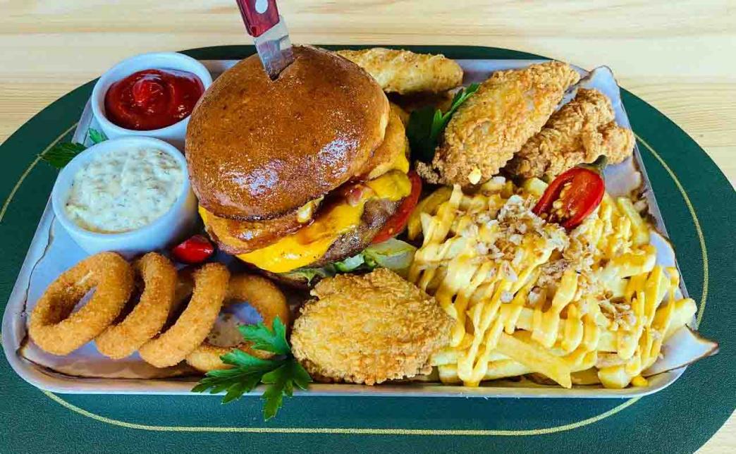 - бургер "Классик" (380 г): крафт-булочка собственного приготовления, котлета из говядины, фирменный соус Jameson, помидор, горчица, красный лук, плавленый сыр чеддер, бекон, салат айсбегрг, маринованный огурец, кольца фри
