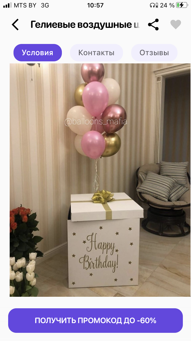 - Промокод дает право на скидку до 60% на гелиевые шары