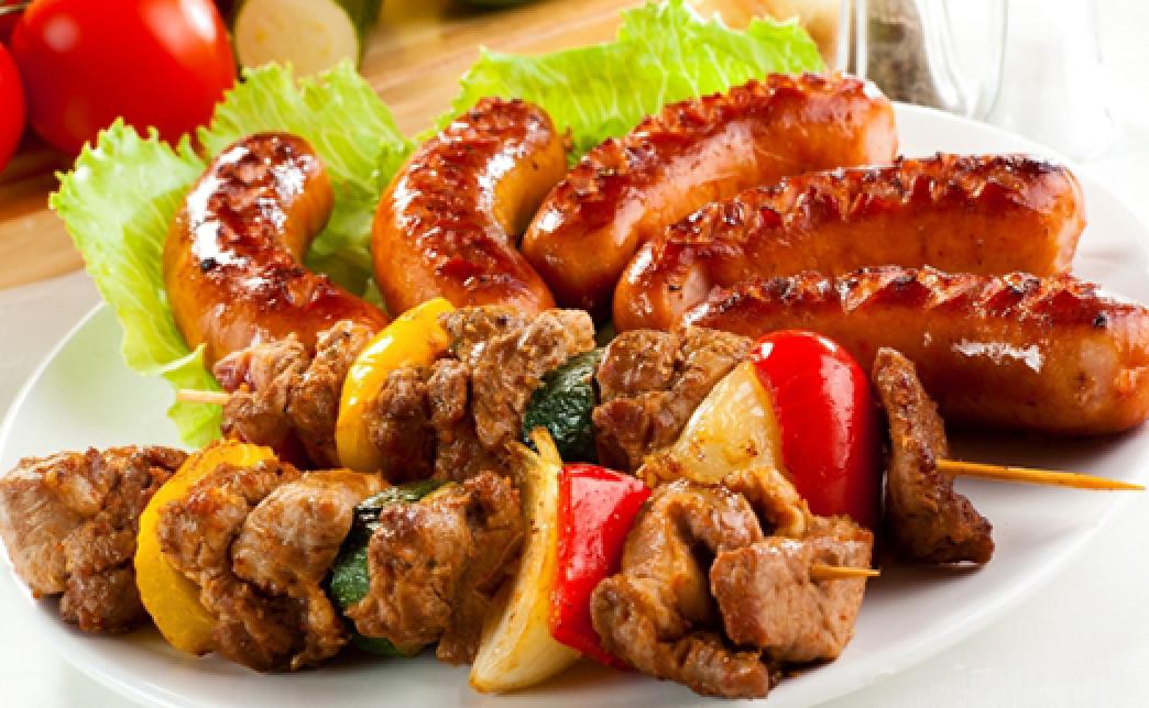 Состав: Шашлык из шеи (250 г), колбаски по-деревенски (250 г), картофель по-деревенски (200 г), огурец свежий(100 г), томат свежий (100 г), салат свежий (50 г), фокачча (300 г), майонез (50 г), кетчуп (50 г.).