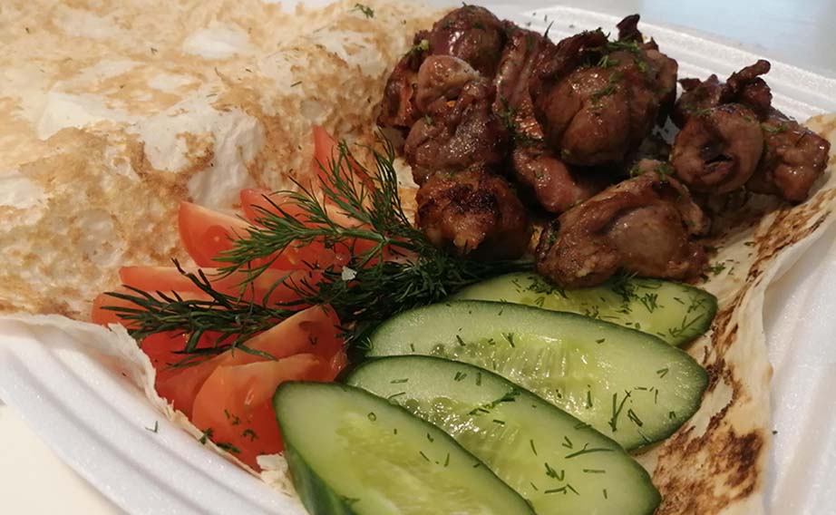 - В мясной сет "Три шашлыка" (1 кг) входит: свинина 200 г/ баранина 200 г/ курица 300 г/ томат, огурец 150 г/ лаваш 150 г.