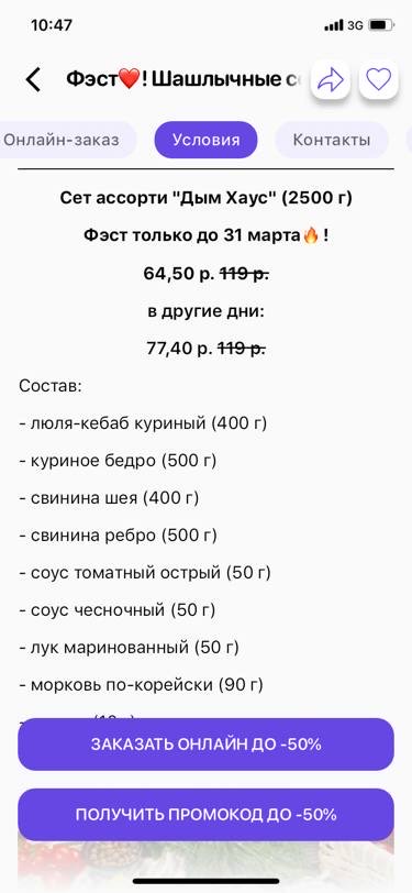 - Промокод также дает право на скидку до 71% на шашлычные сеты в готовом и сыром виде в "Дым Хаус"