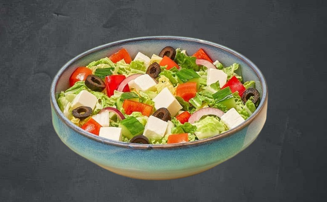 Состав: сыр брынза, огурец, помидор, перец болгарский, лук красный, маслины, масло оливковое