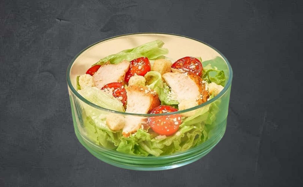 Состав: куриная грудка, листья салата, томаты черри, соус, гренки, сыр пармезан
