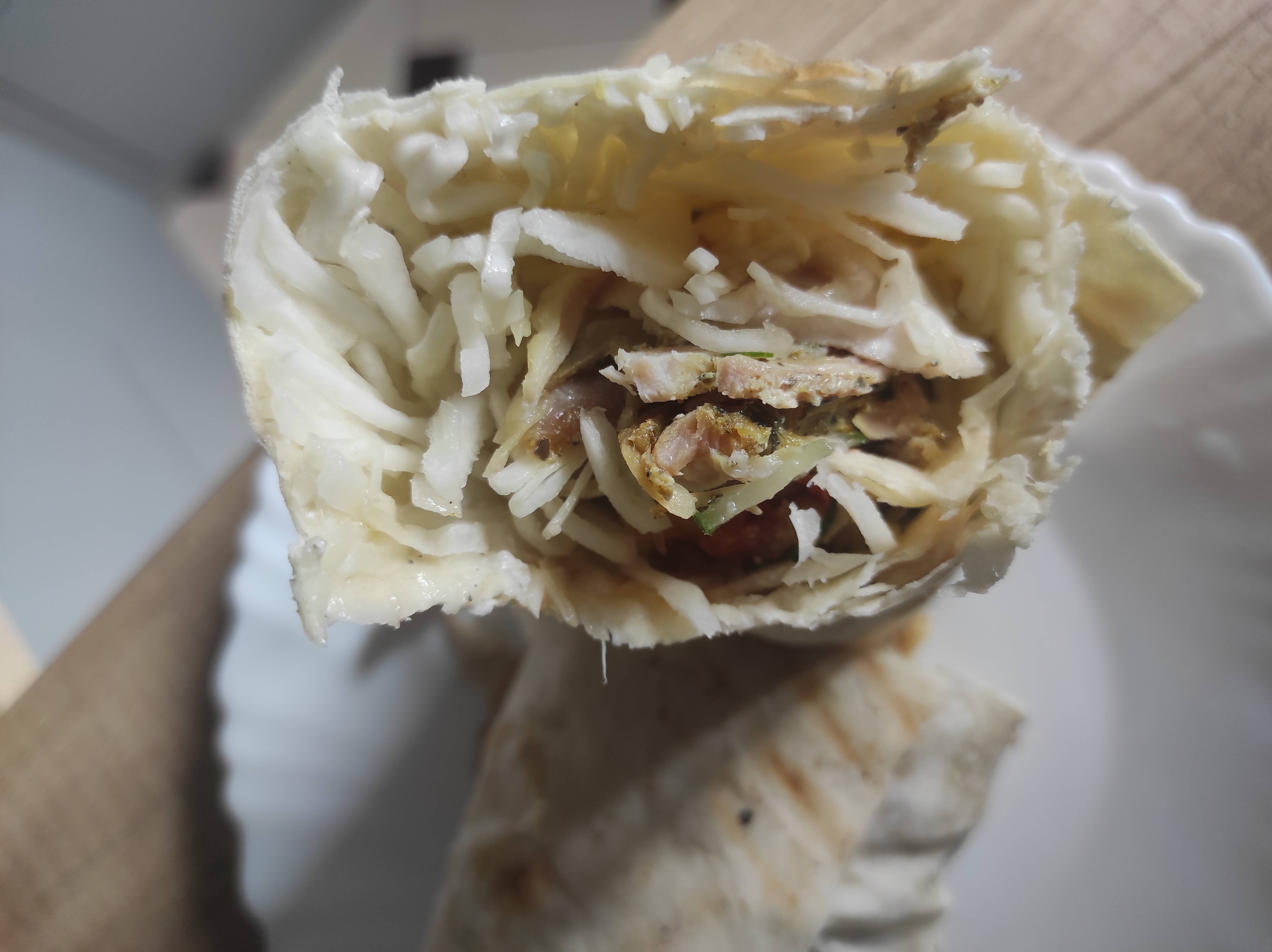 Состав: лаваш, курица, огурец, свежий помидор, сырный соус, фирменный чесночный соус