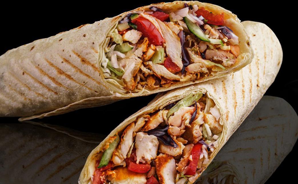 Состав: лаваш, курица, огурец, свежий помидор, халапеньо, фирменный чесночный соус