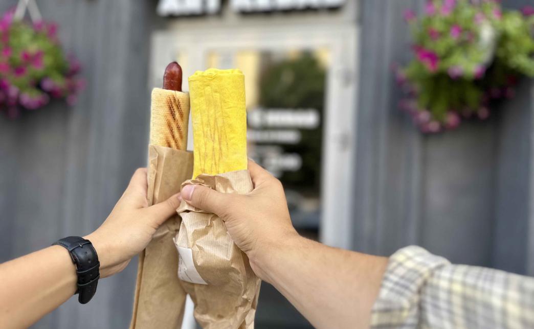 Состав: булка багетная, колбаска охотничья, соус чесночный, соус барбекю