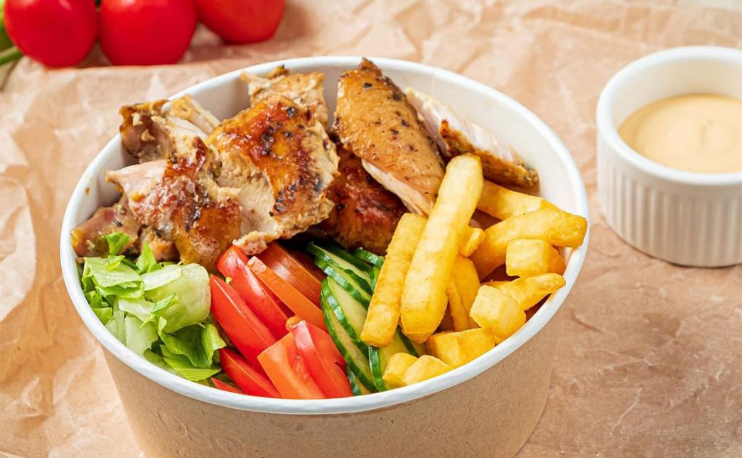 - 5 ланч-боксов с курицей (350 г): курица гриль, салат айсберг, сочный помидор, свежий огурец, картофель фри, соус на выбор