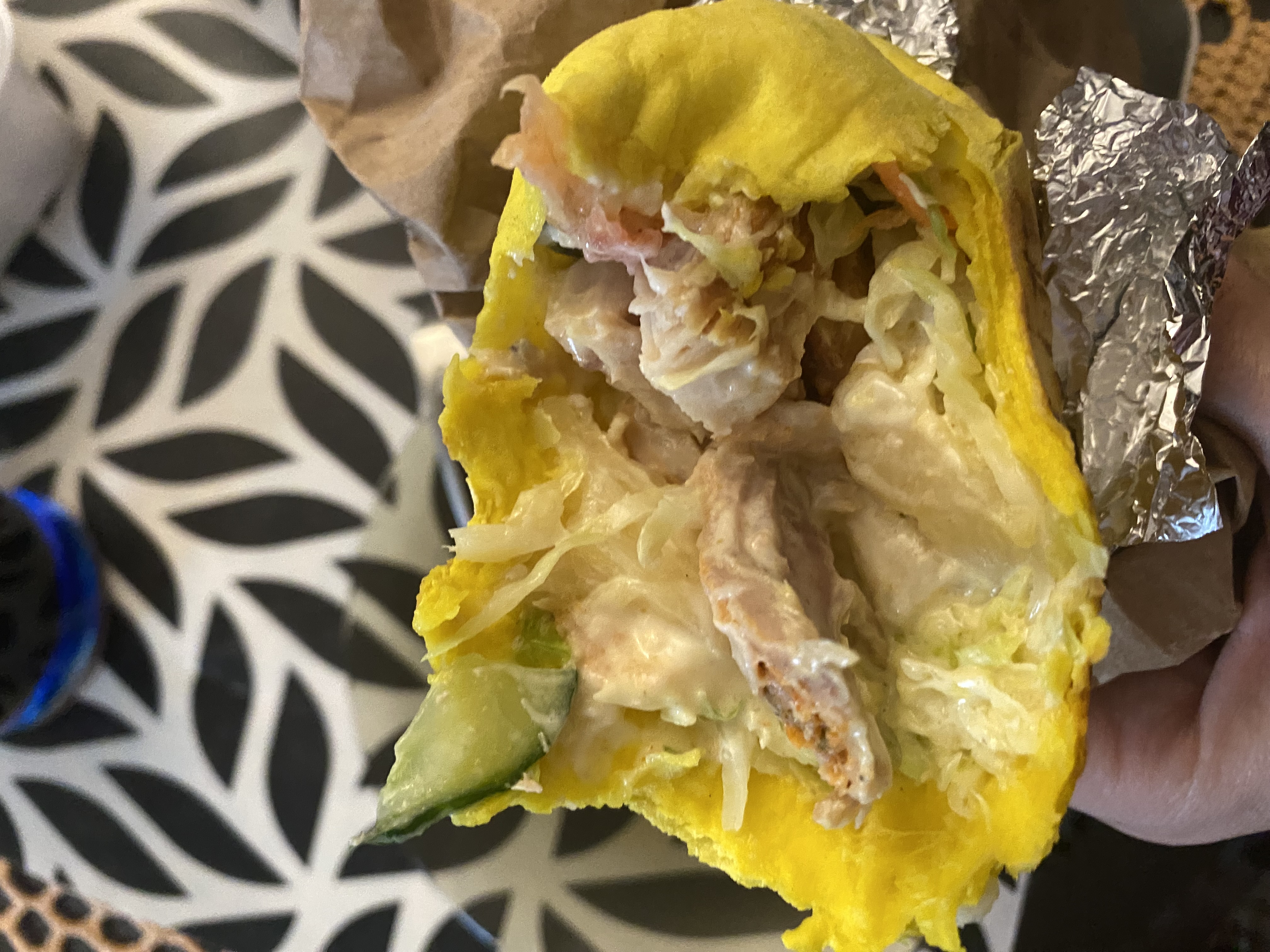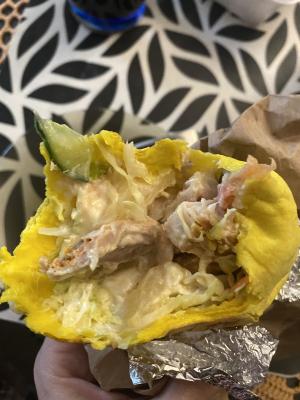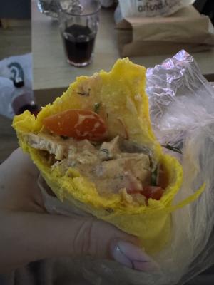 Состав: курочка гриль, сирийская лепешка, трюфельный васабико соус