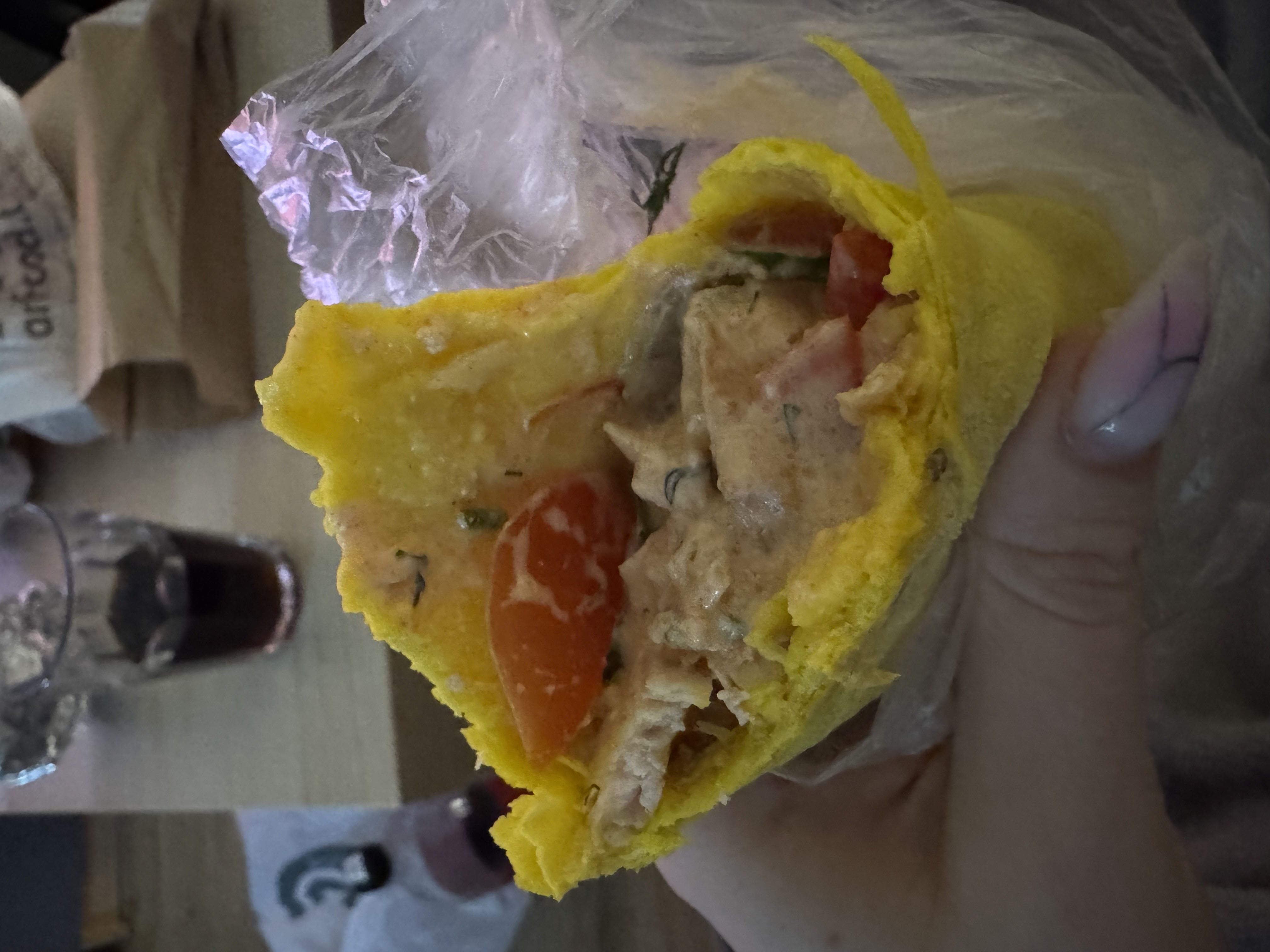 Состав: курочка гриль, сирийская лепешка, соус спайси