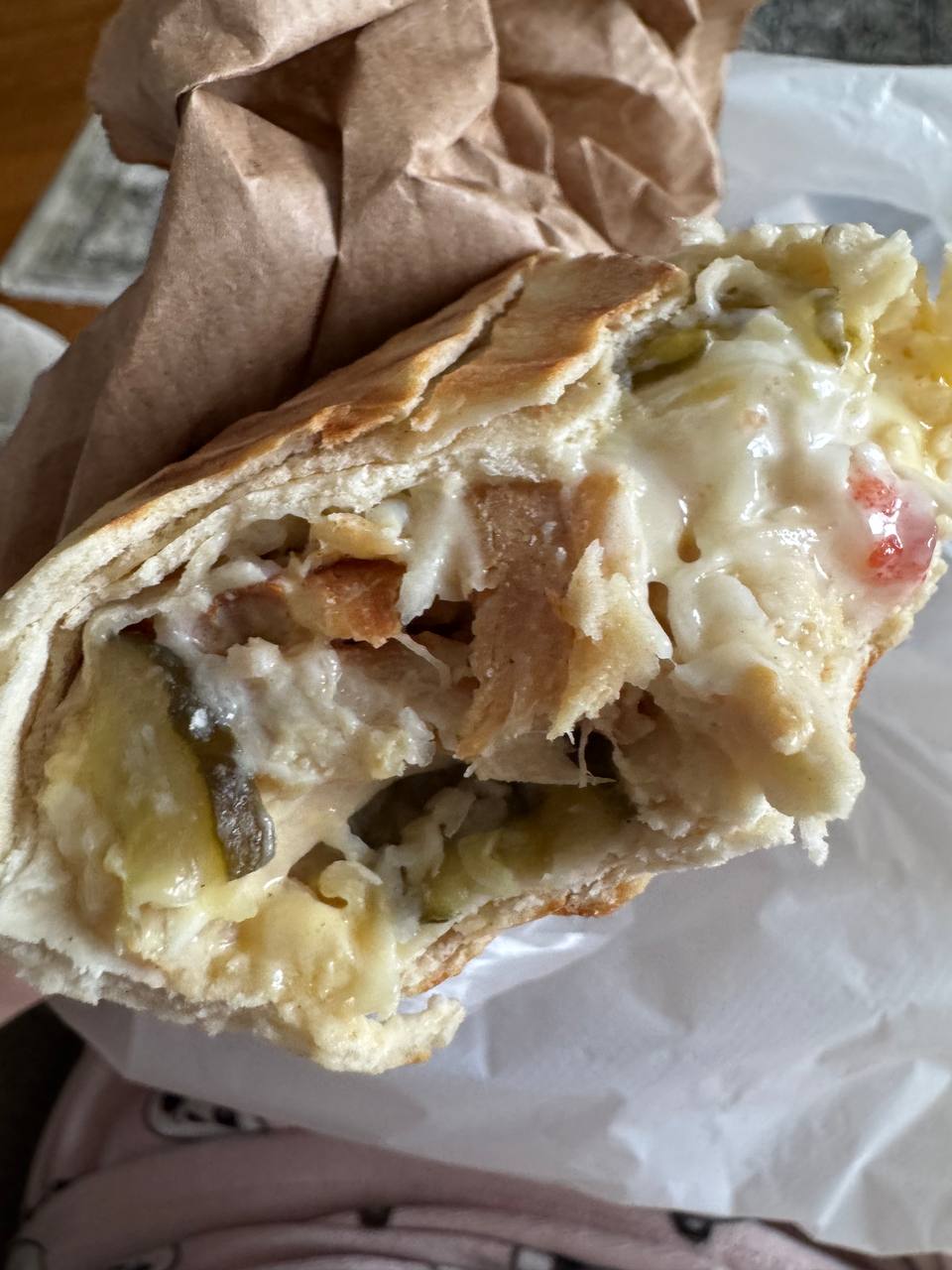 Состав: курочка гриль, сирийская лепешка, сырный соус
