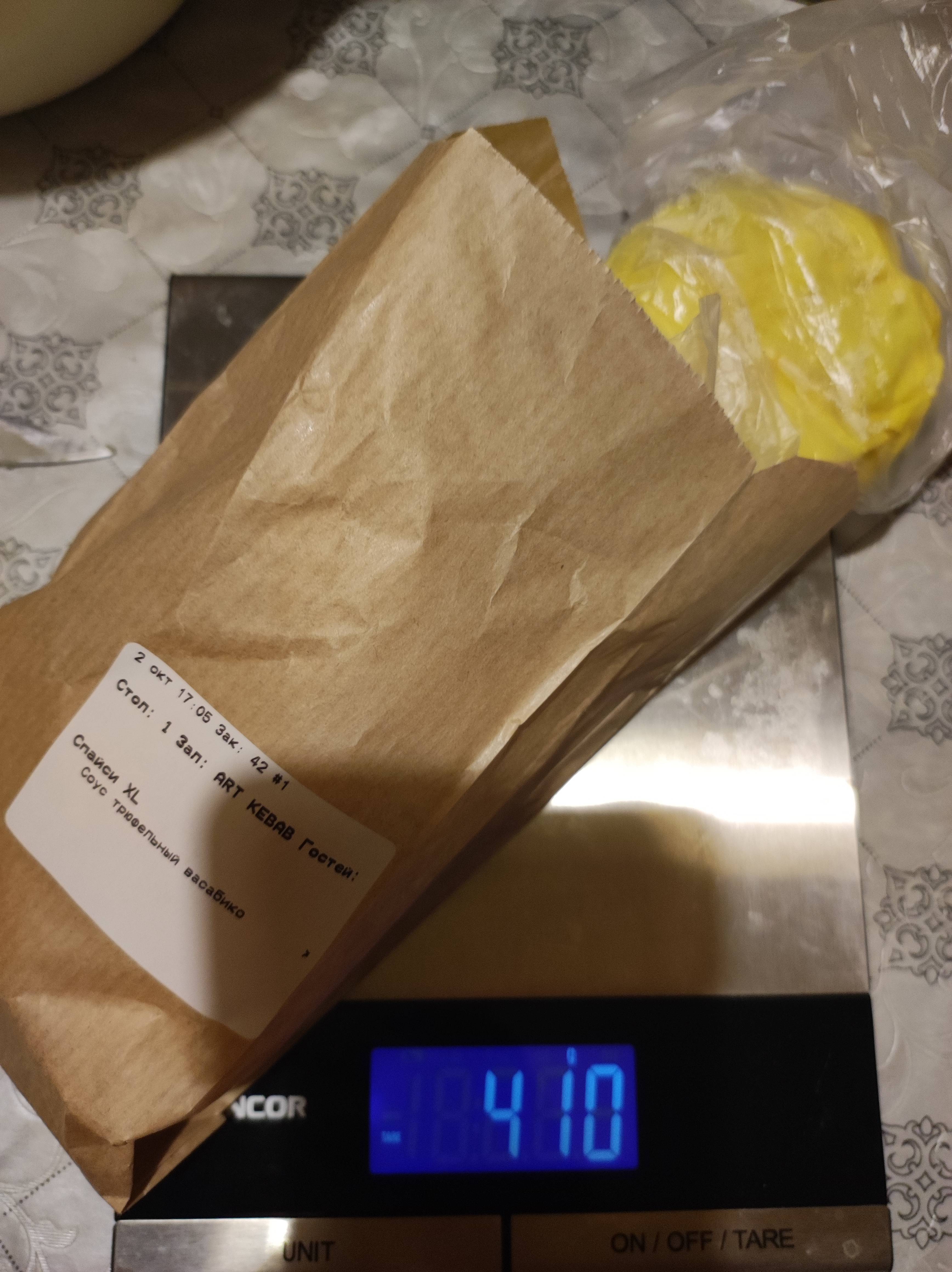 Состав: курочка гриль, сирийская лепешка, трюфельный васабико соус