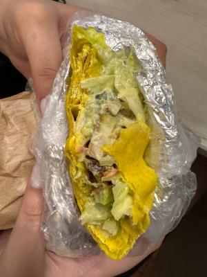 Состав: курица гриль, свежая капуста, пикантная морковь, маринованные огурцы, сочный помидор, соус спайси, сирийская лепешка