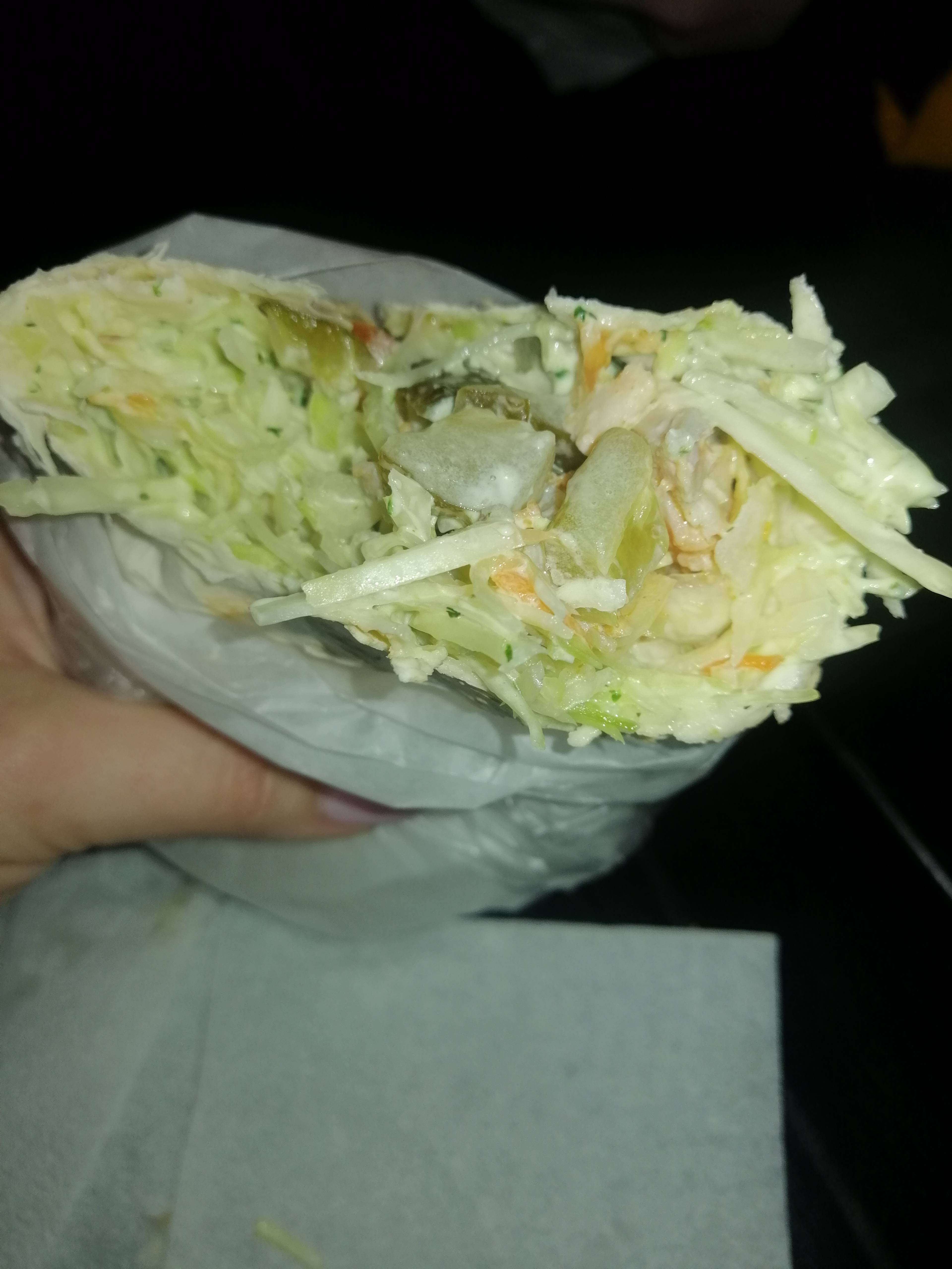 Состав: курица, капуста, огурец, помидор, фирменный соус