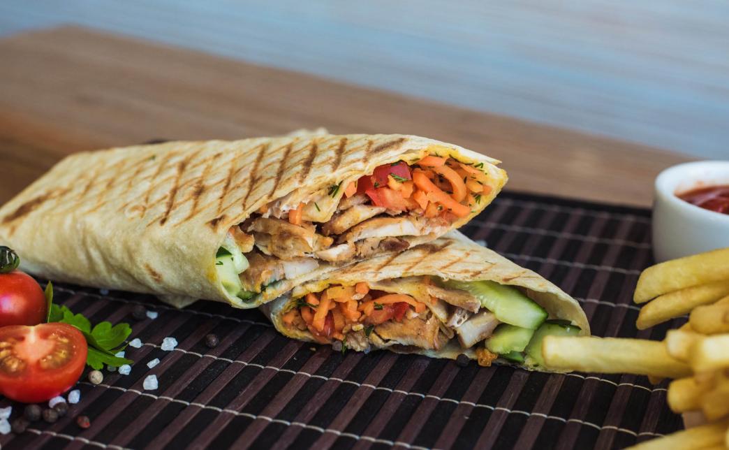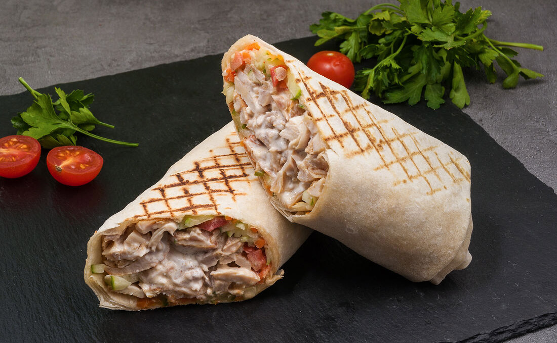 Состав: лаваш, томат, соленый огурец, куриное мясо, сыр, сырный соус