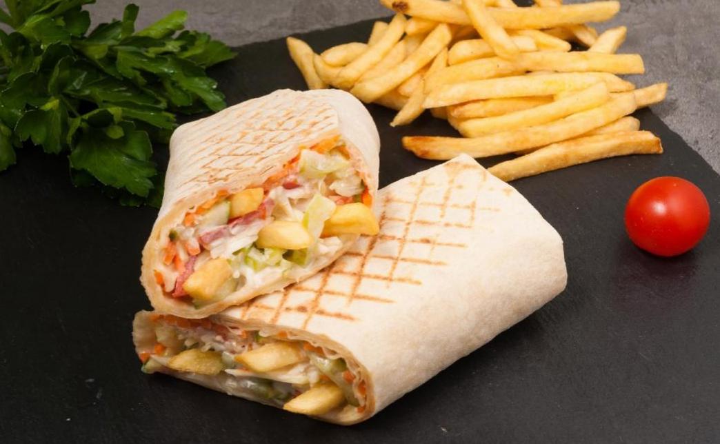 Состав: лаваш, чесночный соус, капуста, соленый огурец, томат, лук с зеленью, куриное мясо, картошка фри, кетчуп
