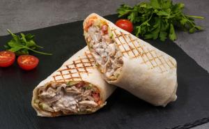 Состав: лаваш, чесночный соус, свежий огурец, томат, капуста, куриное мясо, сыр, сырный соус