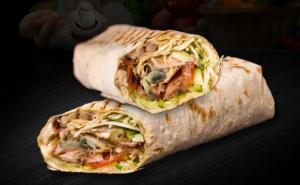 Состав: лаваш, чесночный соус, капуста, свежий огурец, томат, лук с зеленью, куриное мясо, перец халапеньо, острый соус
