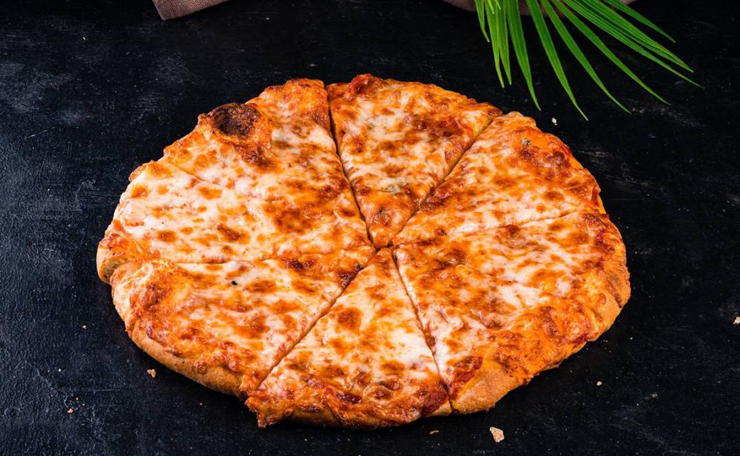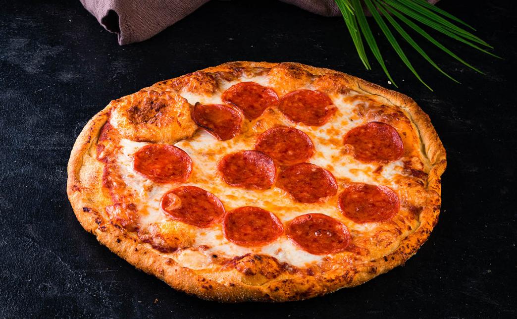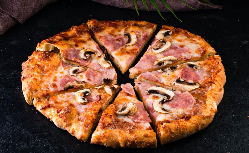 Состав: тесто, соус томатный, сыр, ветчина, грибы