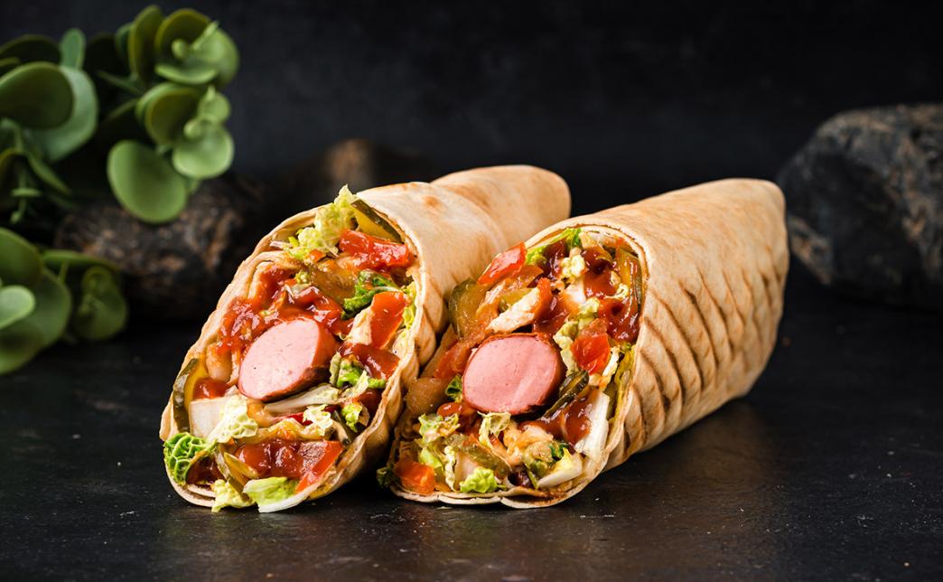 Состав: лаваш, курица гриль, сосиски, огурцы маринованные, капуста, помидор, соус фирменный, соус острый