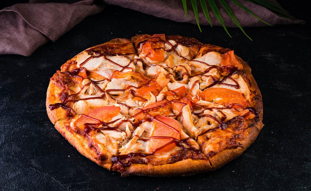 Состав: тесто, соус томатный, сыр, курица, томаты, соус барбекю