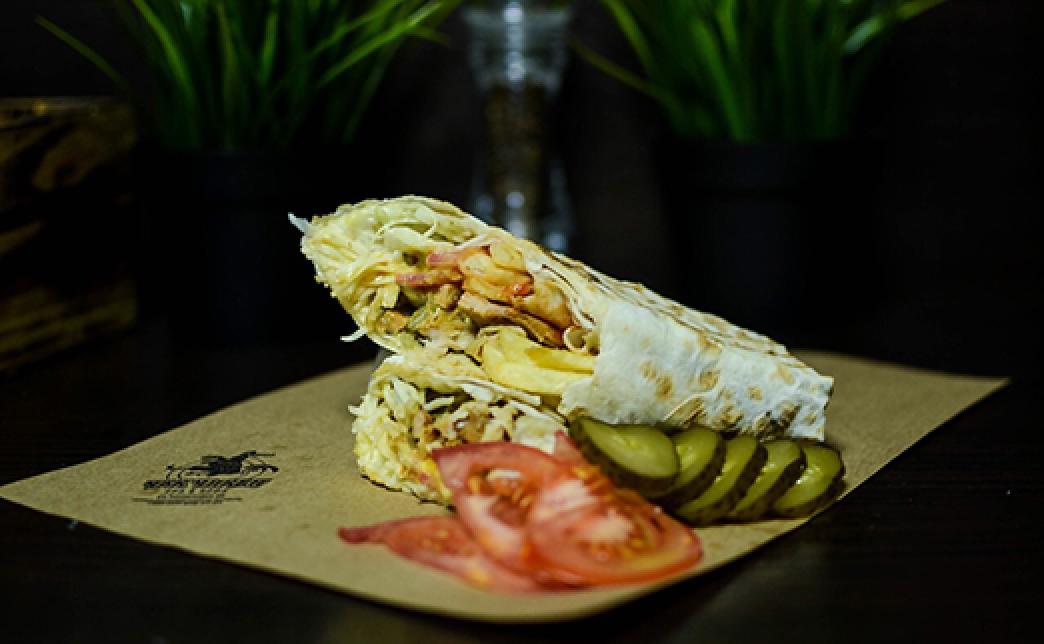 Состав: лаваш, цыпленок, капуста, бочковой огурец, пряная морковь, соус фирменный.