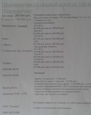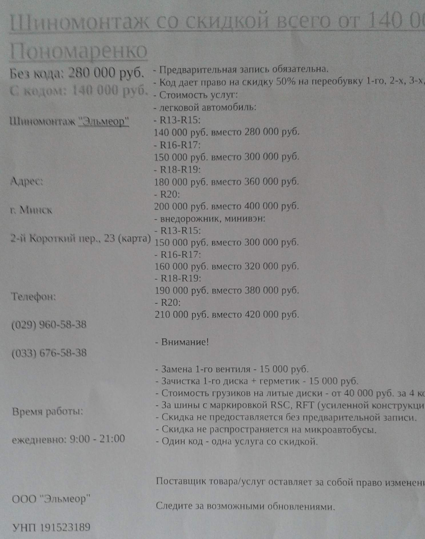 - Промокод дает право на скидку 50% на ремонт проколов, балансировку