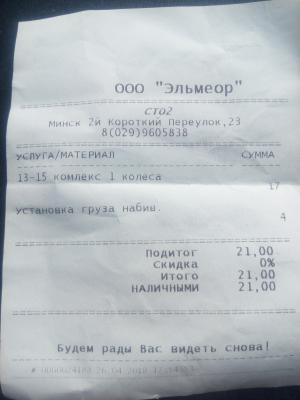- В стоимость комплекса входит: снятие/установка, разборка/сборка колес, балансировка колес, балансировочные грузы клеющиеся и набивные, чистка и герметизация диска (при необходимости), замена вентиля (при необходимости), пакеты для упаковки колес