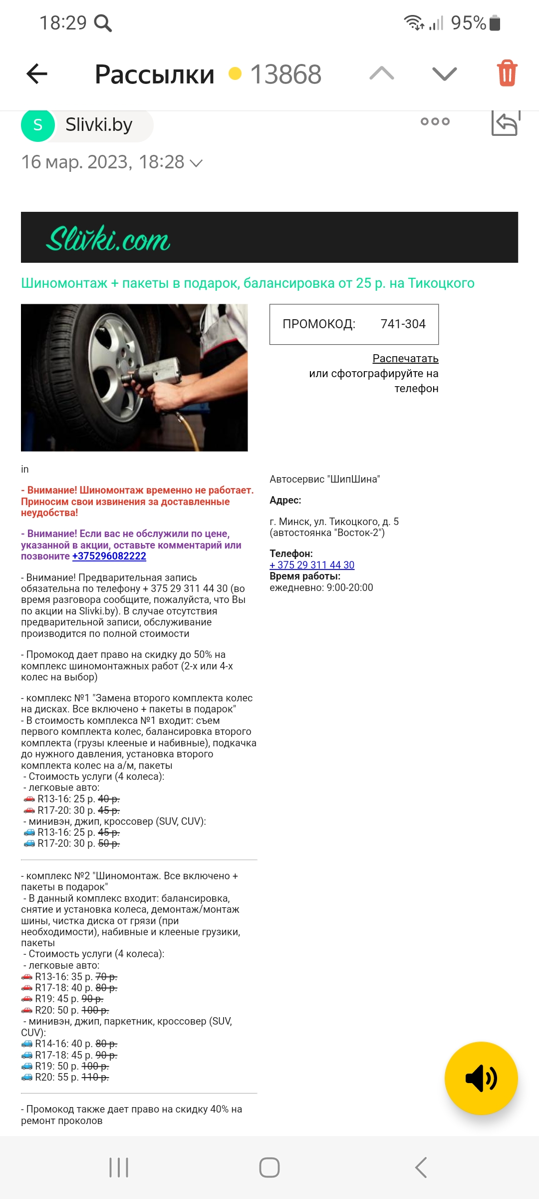 - Промокод дает право на скидку до 54% на комплекс шиномонтажных работ (2-х или 4-х колес на выбор)