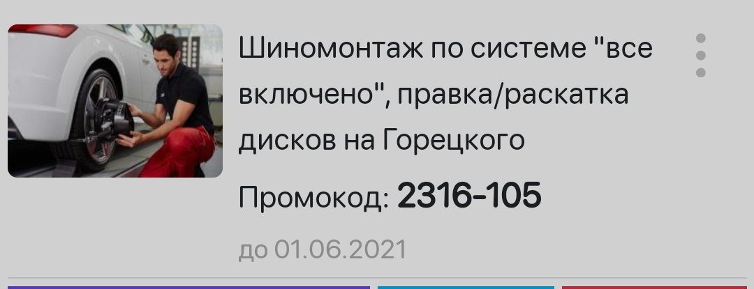 - Промокод дает право на скидку до 50% на шиномонтаж 1-го, 2-х, 3-х или 4-х колес по системе "Все включено"
