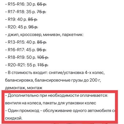 - В стоимость входит: снятие/установка 4-х колес, балансировка, балансировочные грузы без ограничений, демонтаж, монтаж