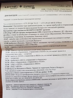 Ездили с Летто тур в Белосток по короткой программе. Очень комфортабельный автобус (расстояние между сиденьями большое), правда автобус от Тур транс компани. Хорошие водители, замечательная сопровождающая Светлана. Понятно все рассказывала, объясняла, решала возникающие вопросы. Понравилась их программа тем, что в Selgros возили автобусом ( по выбору Makro или Selgros). Но так как Selgros открывается позже, то успеть можно за час отовариться в Makro и успеть туда, правда если ватты не надо оформлять.Время на каждую точку отводится стандартно, как у всех. Опаздывающих не ждут, как у всех. Рекомендую ездить с Летто тур. Приятных впечатлений!