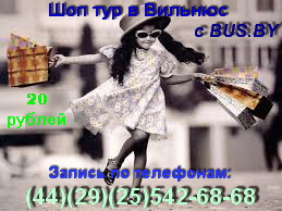 Уважаемые туристы приглашаем Вас на шоп тур 20.01 и 21.01 (программа субботы) с посещением рынка Гарюнай. ***И обращаем Ваше внимание на изменение цены с 01.01.2018. Стоимость по промокоду 25 руб, вместо 30 руб. Все подробности на сайте http://bus.by/turizmbus/shop/vilnius по тел МТС, ВЕЛ, ЛАЙФ 542 68 68. Ваш BUS.BY