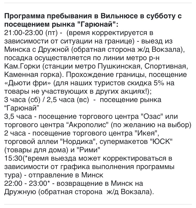 02:00-03:00 - сбор и отправление из Минска в Вильнюс с д/с "Дружная Прохождение границы, посещение "Дьюти фри" (для наших туристов скидка 5% на товары не участвующих в других акциях!);
