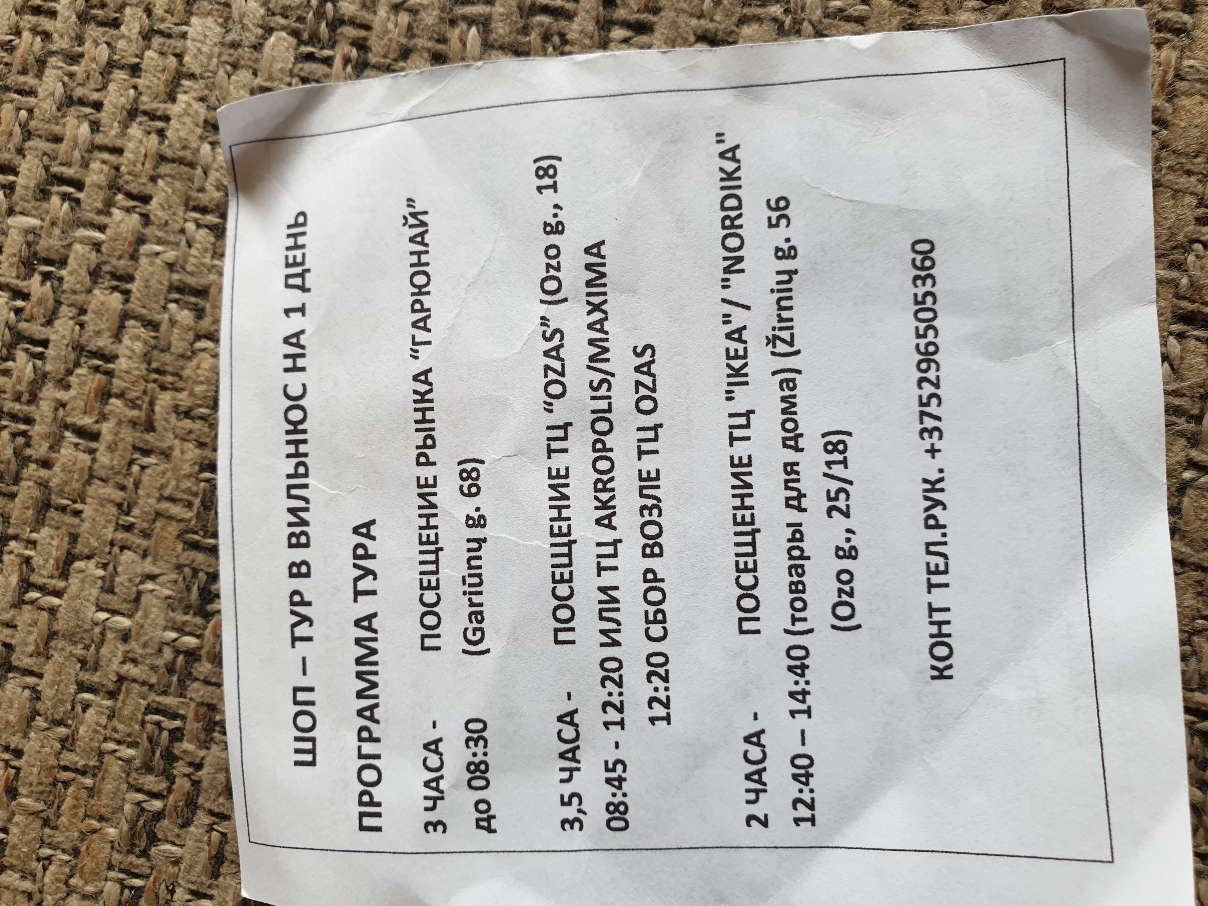 10:00 - прибытие в Вильнюс. остановка у ТЦ "Икея", возможность посещения торговой аллеи "Нордика", супермакетов "ЮСК" (товары для дома) и "Рими", выезд ТЦ "Паркас Аутлет"
