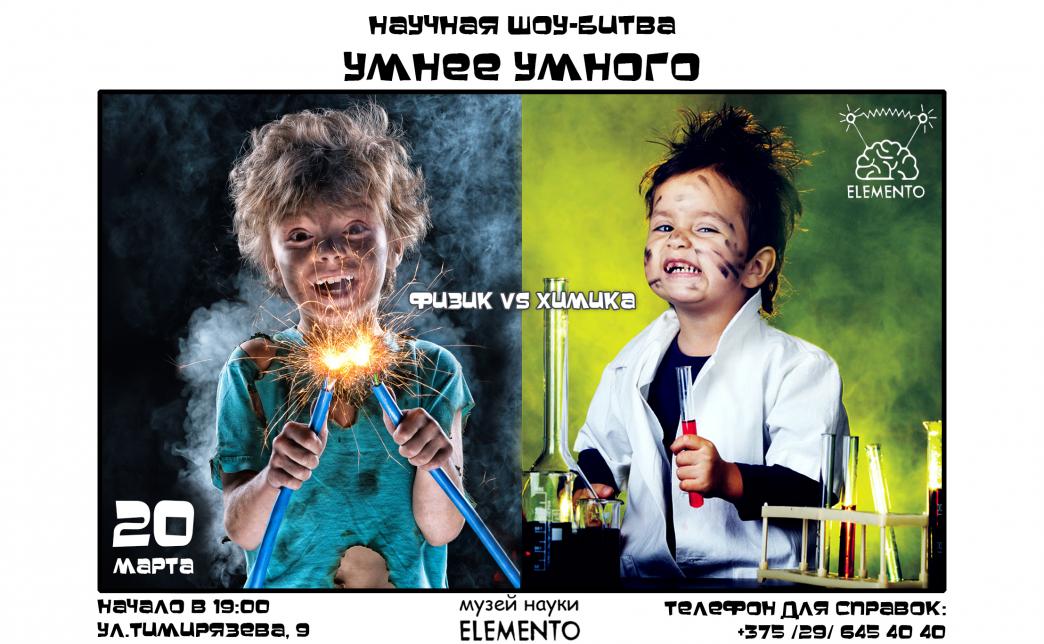 В этот день в решающем научном поединке они смогут наконец выяснить, что на самом деле важней и интересней - физика или химия? Для гостей этого вечера парочка сумасшедших покажет самые удивительные и новые эксперименты из своего арсенала: химик будет взрывать и замораживать, физик - вызывать молнии и стрелять из бластера.