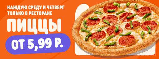 На доставку и в ресторане акция распространяется на все пиццы 30 и 35 см (кроме пицц: из половинок и дополнительных ингредиентов, Мандариновой пиццы, Пиццы Вулкан, Маргарита, Чоризо фреш, Ветчина и сыр, пицца-конструктор, Сырная, Ветчина и Огурчики, Мега Острая, Мега Грибная, Мега Мясная, Мега Сырная, Мега Барбекю, Мега Ранч, Мега Сырный цыпленок, Мега пицца с беконом, Мега Охотничья). В подарок выдается пицца с меньшей стоимостью!