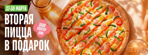Акция распространяется на пиццы 35 см: Охотничья, Четыре сезона, Бургер-пицца, Гавайская, Аррива!, Карбонара, Терияки, Деревенская, Овощи и грибы, Двойная пепперони, Мясная, Цыпленок барбекю, Цыпленок ранч, Сырный цыпленок, Песто, Пицца Жюльен, Кантри-пицца, Баварская, Чилл Грилл, Додо Микс, Додо, Мясной микс с баварскими колбасками, Бефстроганов, Четыре сыра.