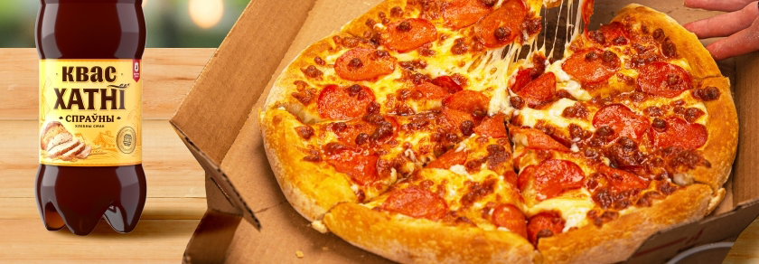 - средняя пицца (на выбор из перечня) + Квас Хатнi Спраўны (0,9 л) или Квас Хатнi Цемны (0,9 л).