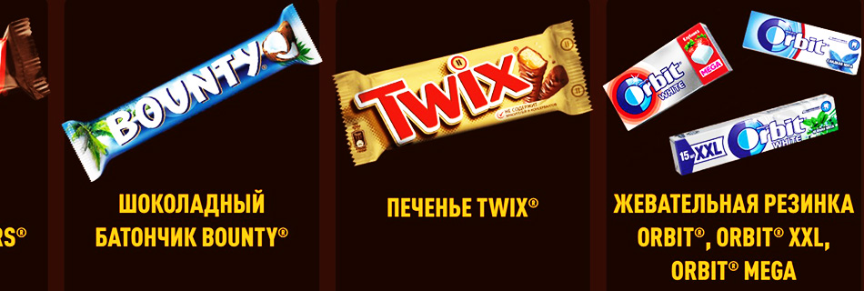 - в сети магазинов "Соседи" купить в одном чеке жевательную резинку "Орбит" (Orbit) и на выбор шоколадный батончик "Сникерс" (Snickers), "Баунти" (Bounty) или печение "Твикс" (Twix).