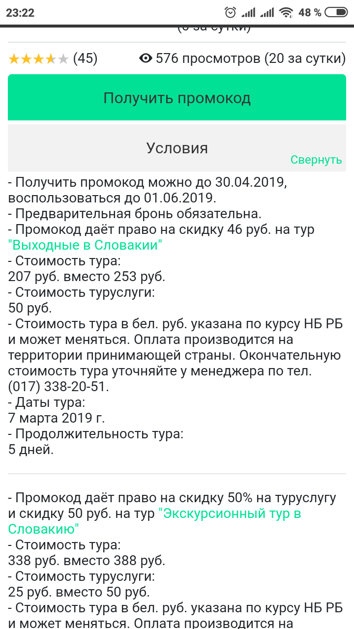 - Промокод даёт право на скидку 46 руб. на тур "Выходные в Словакии"