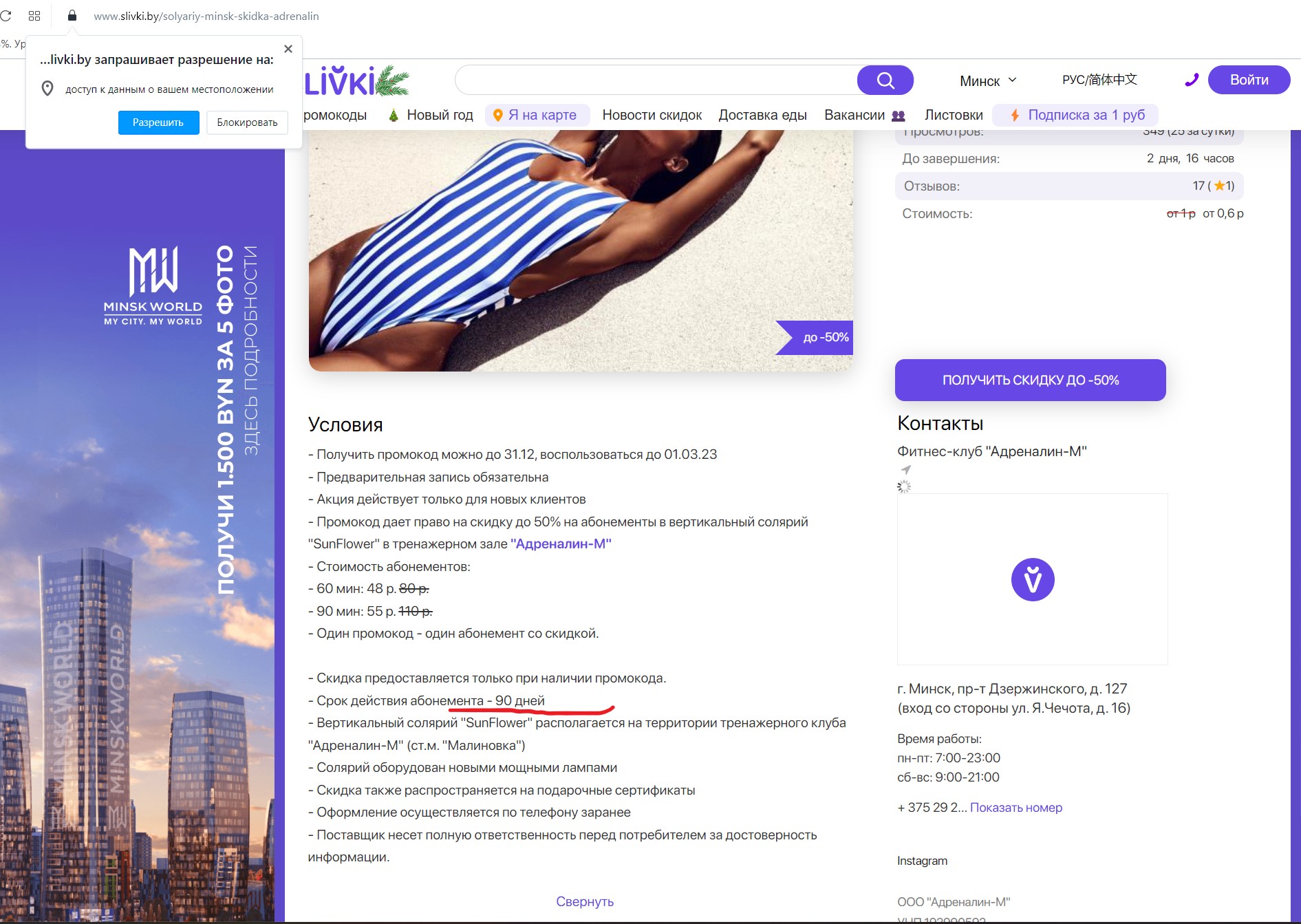 - Промокод также дает право на скидку до 33% на абонементы в вертикальный солярий "SunFlower" для всех клиентов