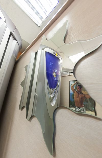 Дизайн и конструкция солярия - это органичная композиция из элементов пластмасс и алюминия. Такие новинки, как хромированный рефлектор, а также серийные функции ACS и BodyCool - новая система обдува тела с четырьмя каналами подвода воздуха - и дополнительные функции aguaCool, megaVoice и mp3-sound-box делают вертикальный солярий MegaSun TOWER PURE ENERGY настоящей звездой.