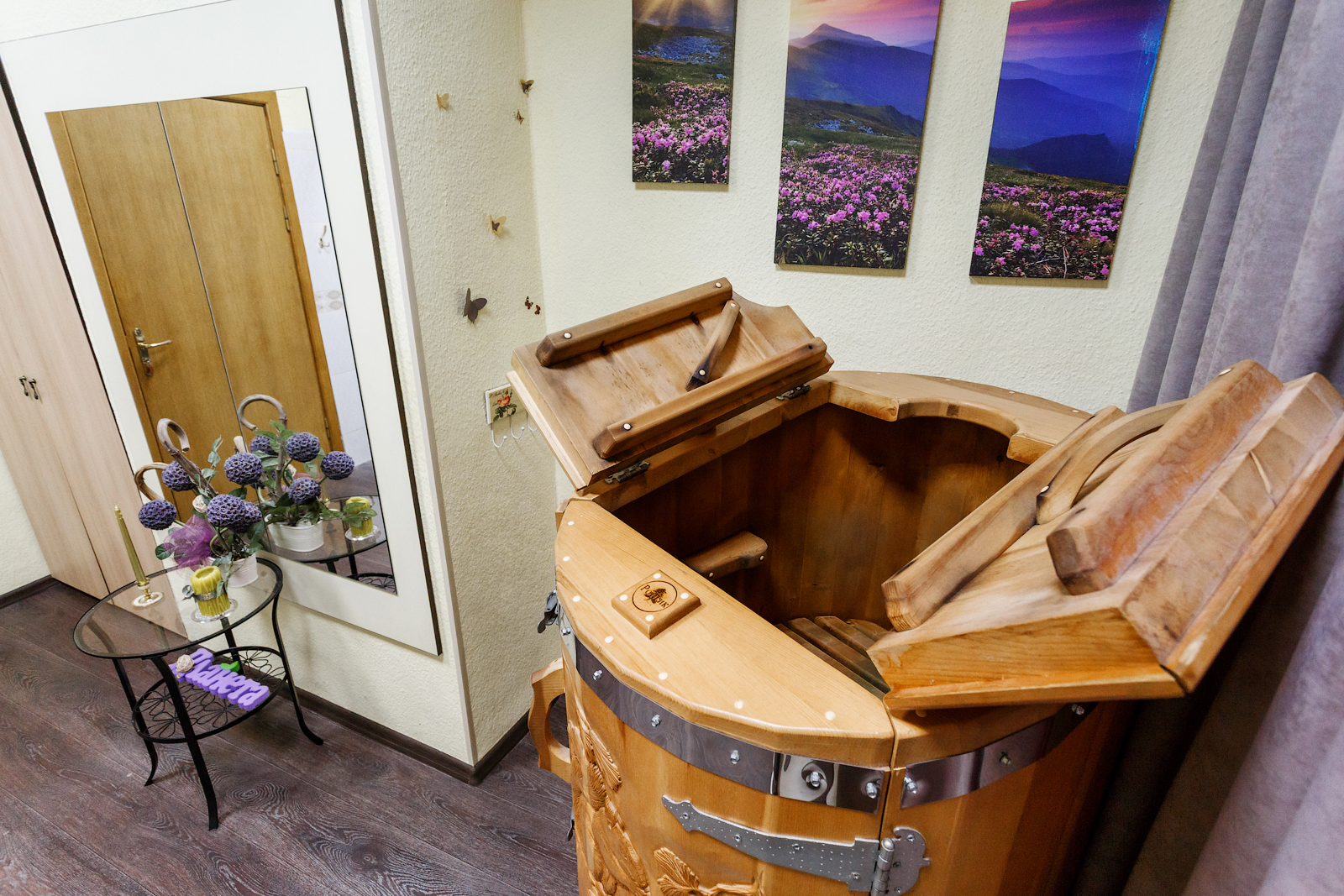 Этапы программы: - кедровая бочка - очищение кожи с помощью скраба для тела - аромо-релакс (30 мин).